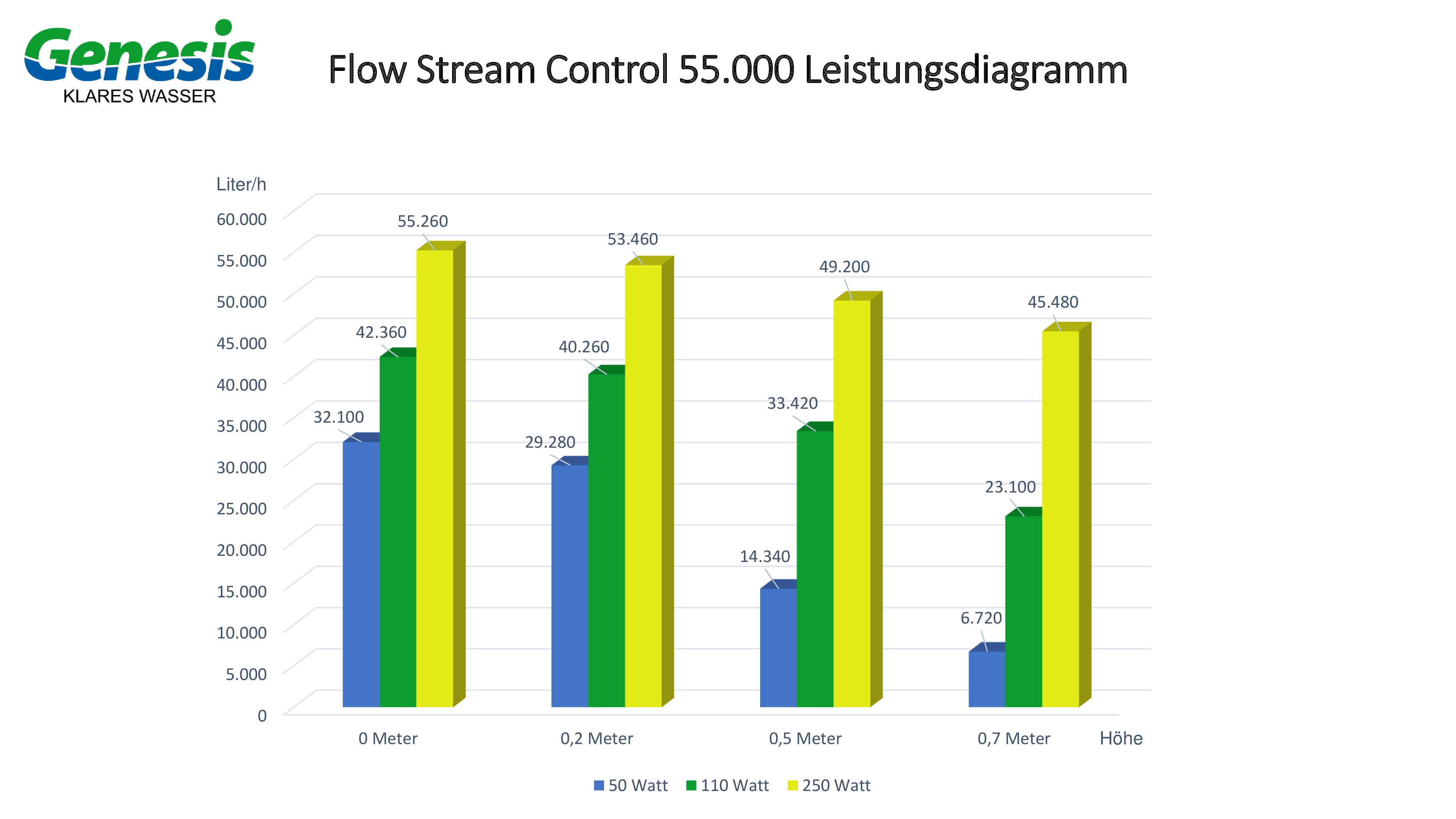 The advanced EVO Flow Stream 55,000 pump from Genesis is a true innovation with a flow rate of 55,000 litres and a power consumption of only 250 watts. It offers a very robust design.