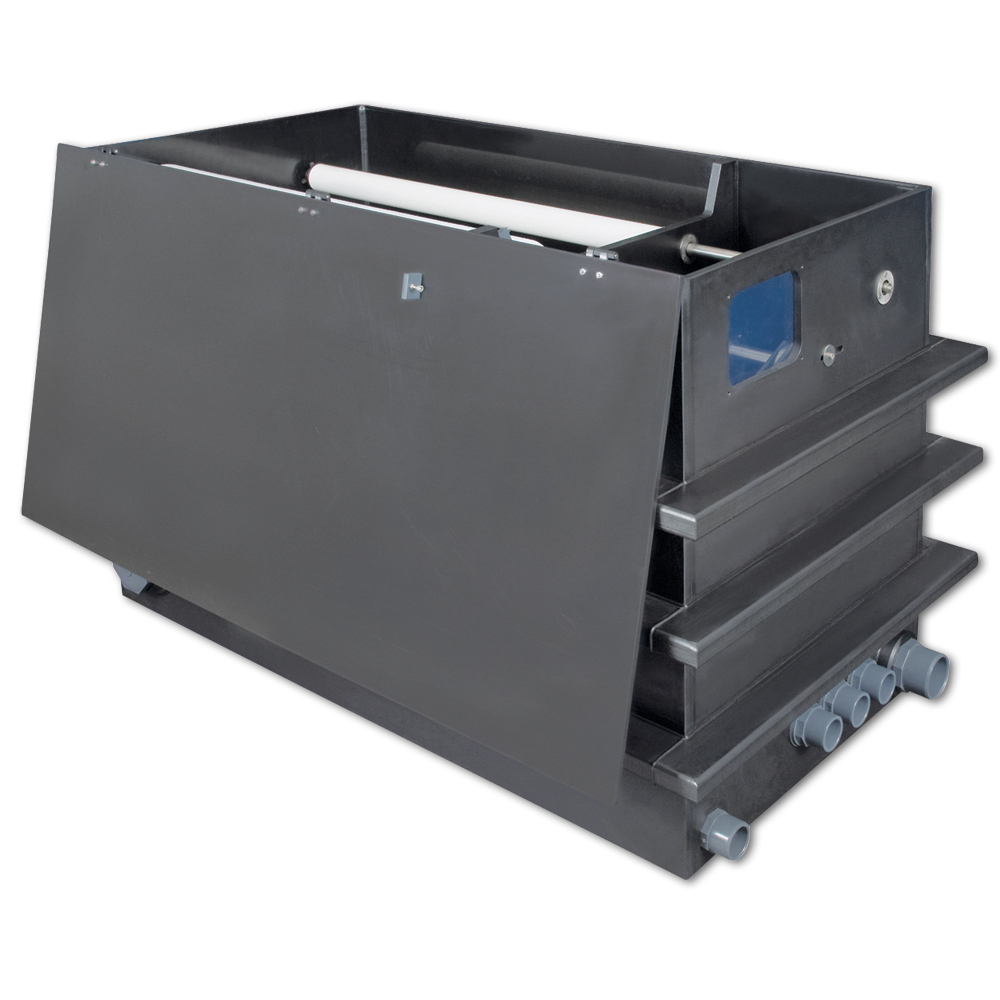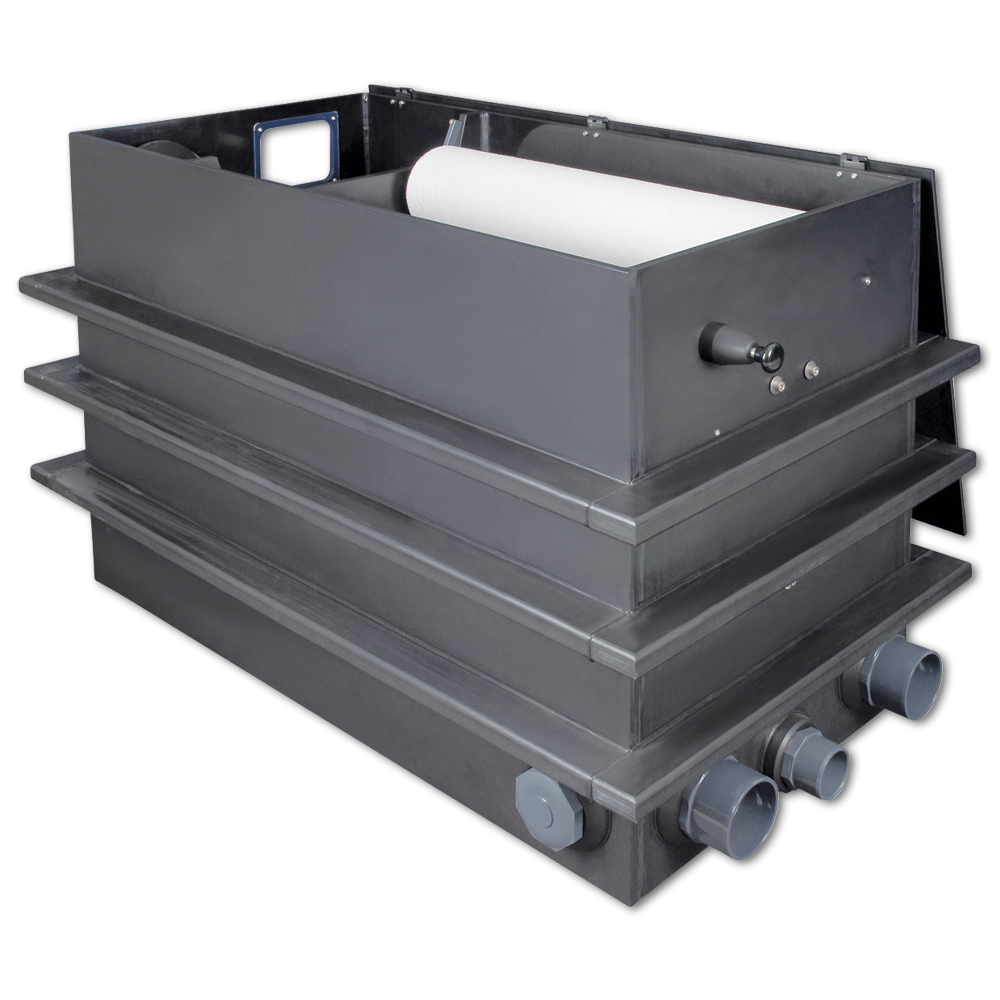 The filter's mode of operation is so simple that it sounds almost unbelievable. A pump feeds the water into the filter. The water must pass through paper fleece, which immediately retains all suspended particles. The clean water enters the biological stage, where dissolved substances such as ammonium and nitrite are broken down, and from there the water returns to the pond. Over time, the filter fleece becomes increasingly clogged and the water level in the filter rises. An overflow activates a mechanism that automatically moves the filter fleece without electricity until sufficient water flow is achieved again. This prevents overflowing or filter malfunction.