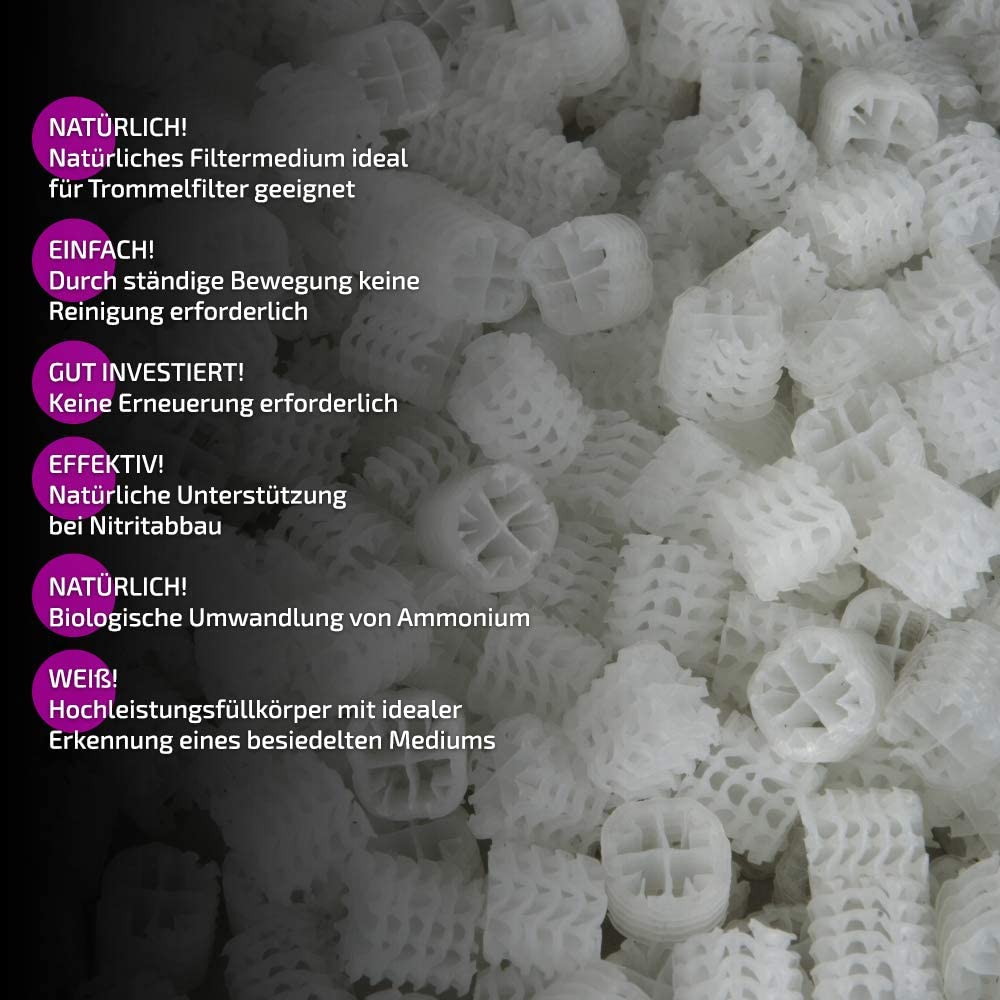Hel-X® 17 KLL filter media ensures good water quality in your pond with the highest possible degradation performance in nitrification. Hel-X® 17 KLL filter media is therefore very well suited for the degradation of ammonium and nitrite in the final filter chamber (clear water) and, due to its constant movement, does not require cleaning or replacement. Hel-X® 17 KLL pond filter material can also be used for biological wastewater treatment.