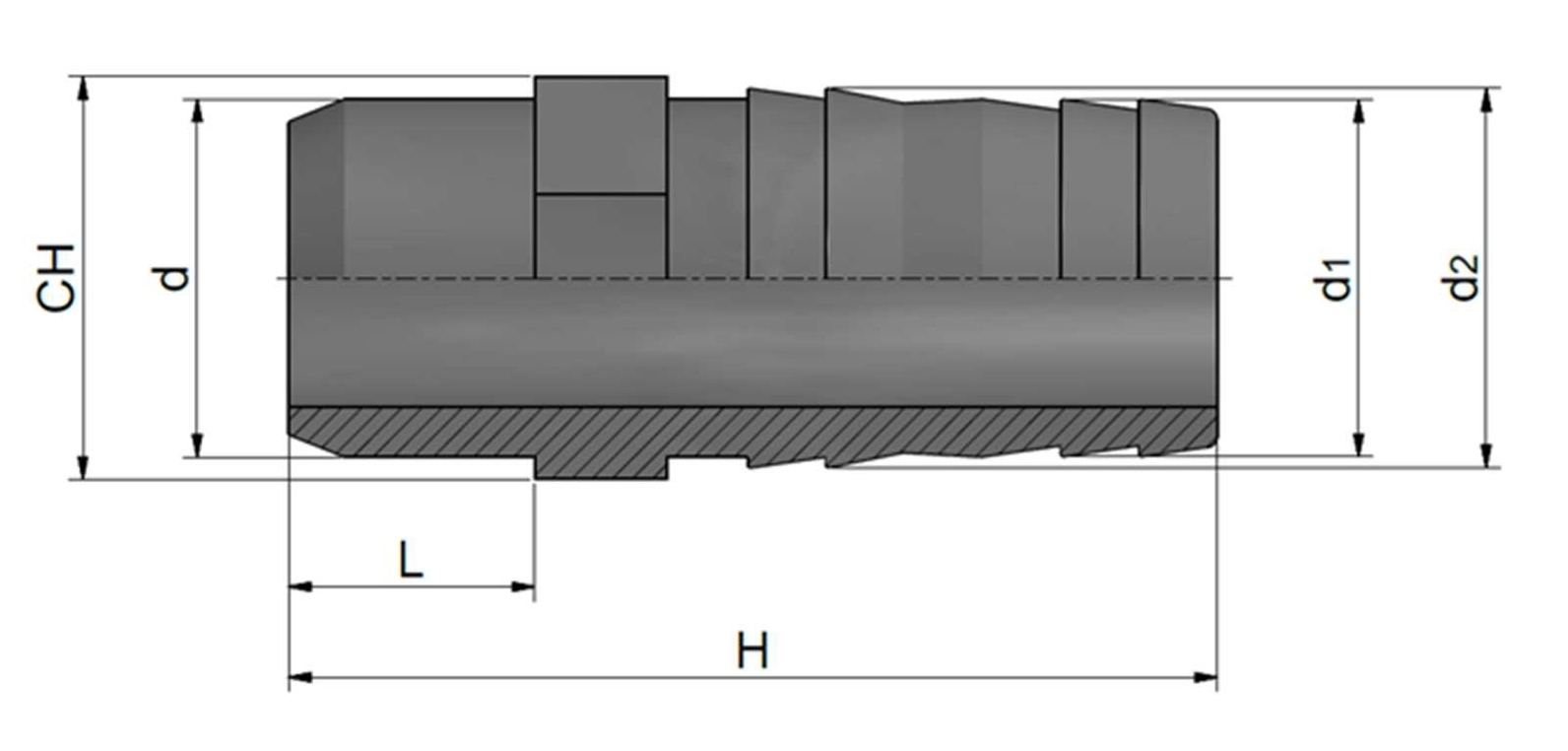 | (d) Diameter left | (d1) Diameter (largest) on the right | (d2) Diameter on the right | (L) Length of adhesive joint | (H) Total length | (CH) Diameter (largest) left | Weight |