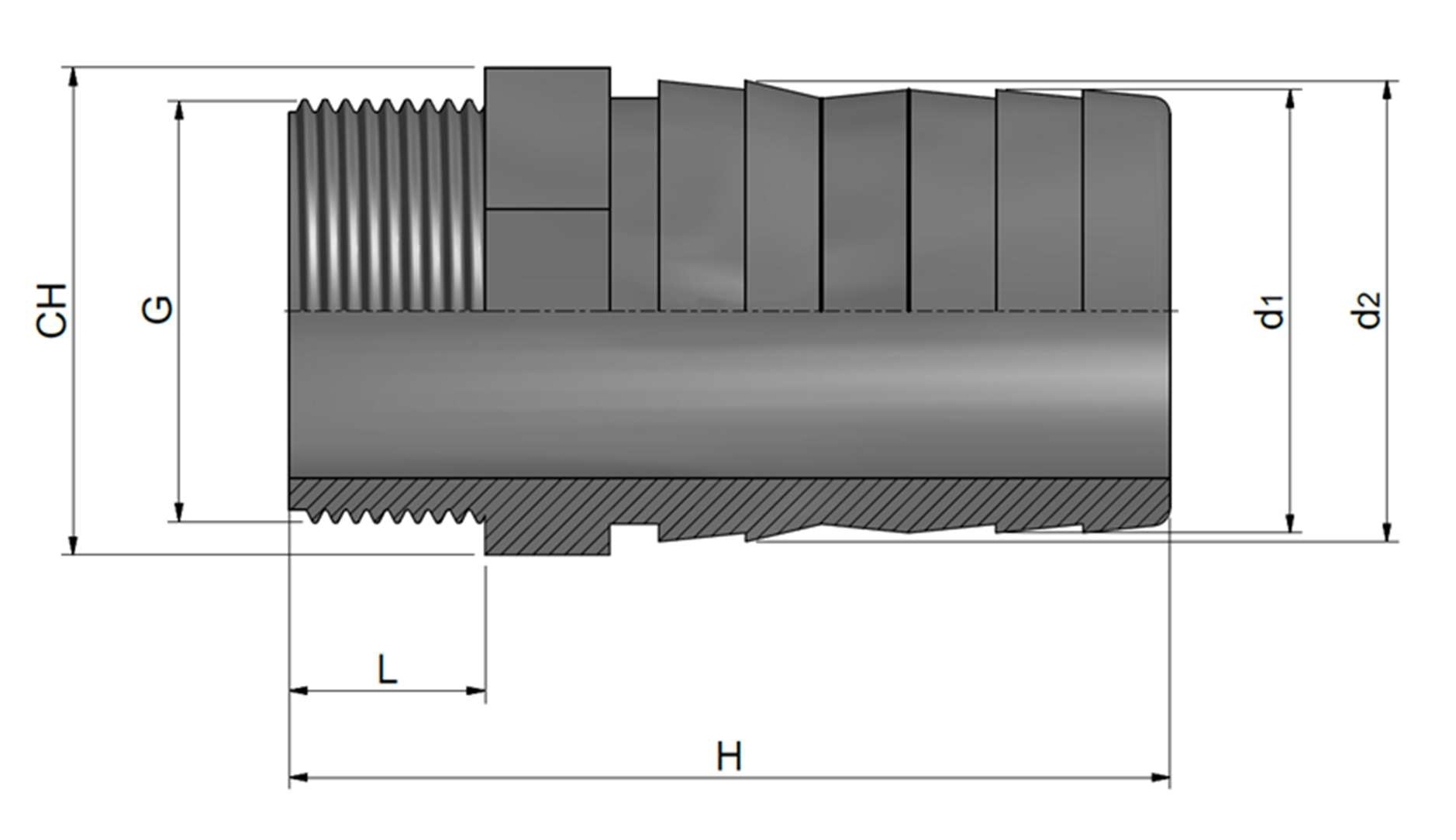 | (G) Thread diameter | (d1) Diameter right | (d2) Diameter (largest) right | (L) Thread length | (H) Total length | (CH) Maximum diameter | Weight |
