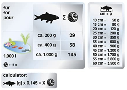 The dosage depends on the existing stock. 145 balls are required per 1,000 grams of fish. For a moderately stocked pond with approx. 200 g of fish and a maximum stock of 1,000 g of fish per 1,000 litres of pond volume, a 10-litre pack containing 210 balls will last for 1,500 to 7,300 litres, and a 50-litre pack containing 1,050 balls will cover 7,350 to 37,000 litres.
