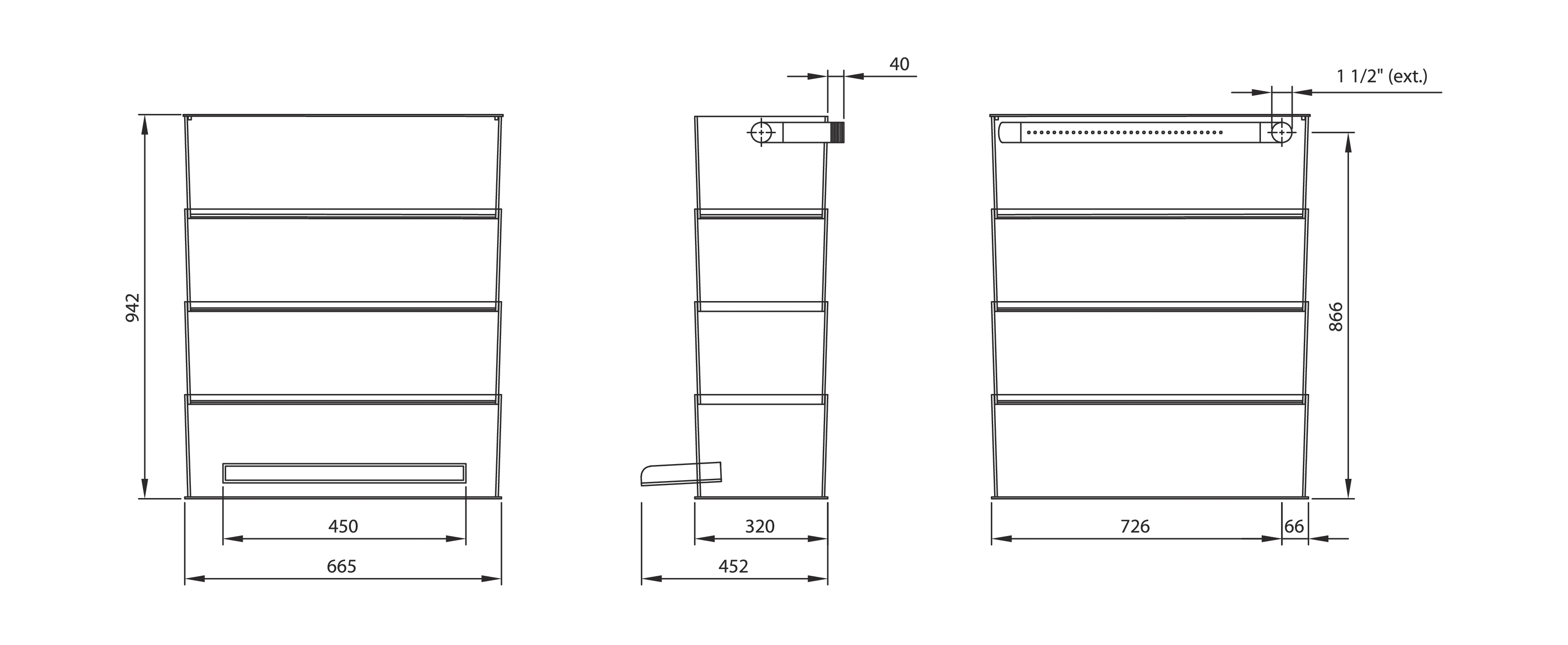 Dimensions: L x W x H 665 x 452 (500 with lip) x 942 mm