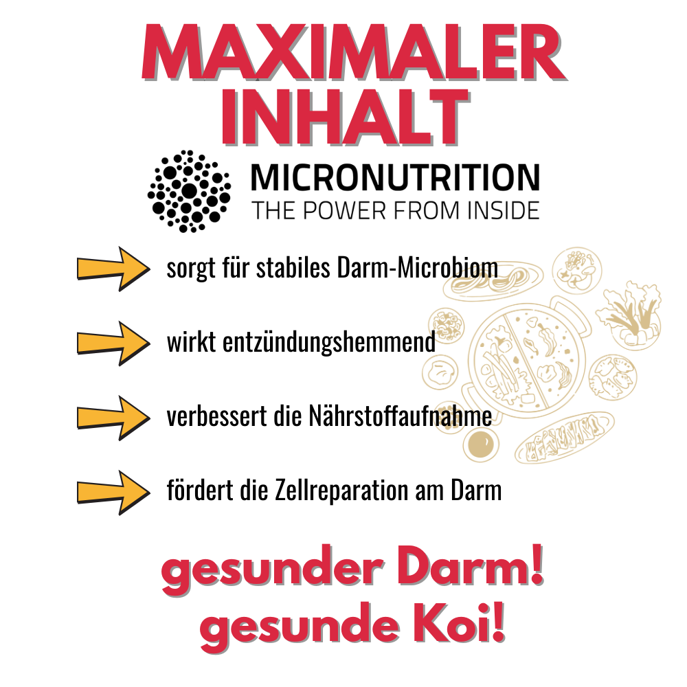 And that is what this feed is mainly about. Thanks to its high-quality ingredients and large amounts of premium fish meal, micronutrients and immune stimulants, this food guarantees exceptional growth in koi. The fish's reserves are stimulated, as their health and immune system are strengthened in such a way that the fish grow naturally large. The pellet size has been deliberately chosen to be slightly smaller so that fish of all ages can enjoy it. The feed has been produced in such a way that it sinks slowly to the bottom. This prevents a feeding frenzy in the water and allows even shy and slow koi to access the feed.