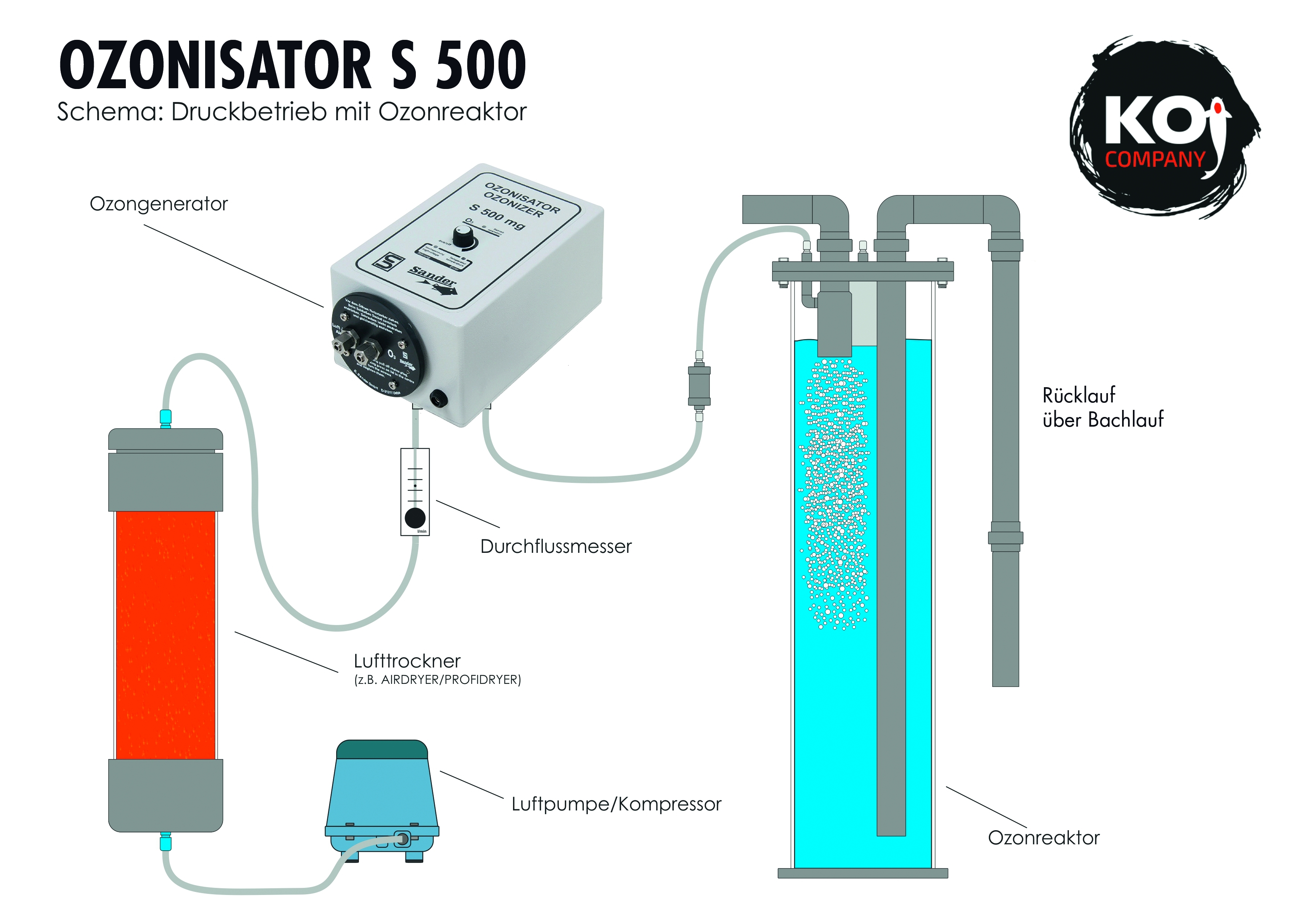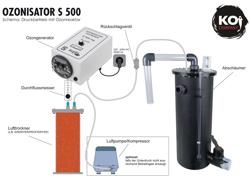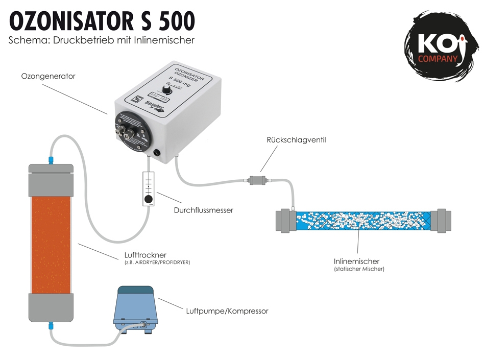 The ozone O³ generated in the Sander C-300 (300 mg) ozonator must be fed into an ozone reactor by means of air. In the ozone reactor, the ozone is then mixed with pond water.