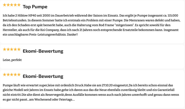 Ja. Die Hiblow HP-Serie ist für den 24/7-Dauerbetrieb im Koiteich konzipiert. Bei korrektem Anschluss und Wartung sind über 20.000 Betriebsstunden realistisch.