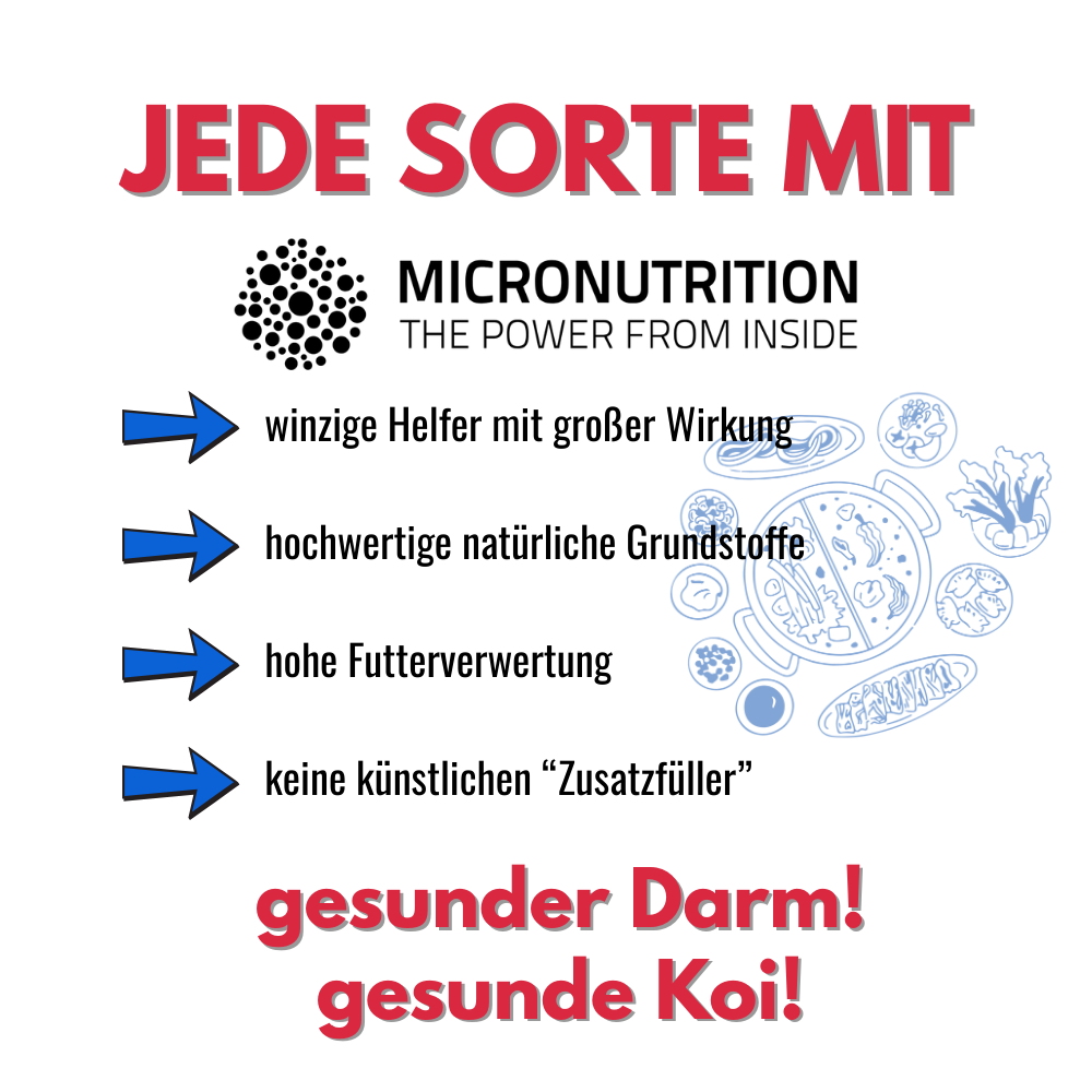 If you take a closer look at the manufacturer (Alpha CH 31265), you will inevitably come across the exclusive micronutrient complex AQUACULTURE GUARD®. This substance is contained in all of our Tri Koi® feed varieties from Hokovit, as well as the exclusive herb mixture from Kenko® Extra.